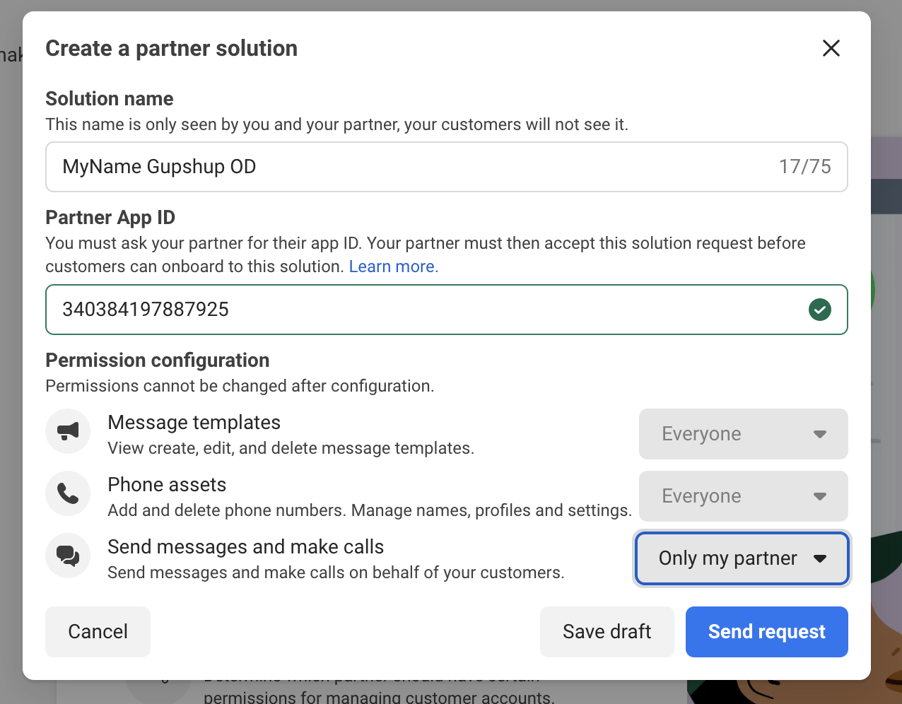 Select 'ONLY MY PARTNER' for 'Send messsages' Permissions, else your request will be rejected by Gupshup. This is needed for Gupshup to be able to do messaging. Then submit request. NOTE : If you select 'ONLY ME' the permissions are non-editable in future. You will need to create a fresh solution ID with correct permission settings.
