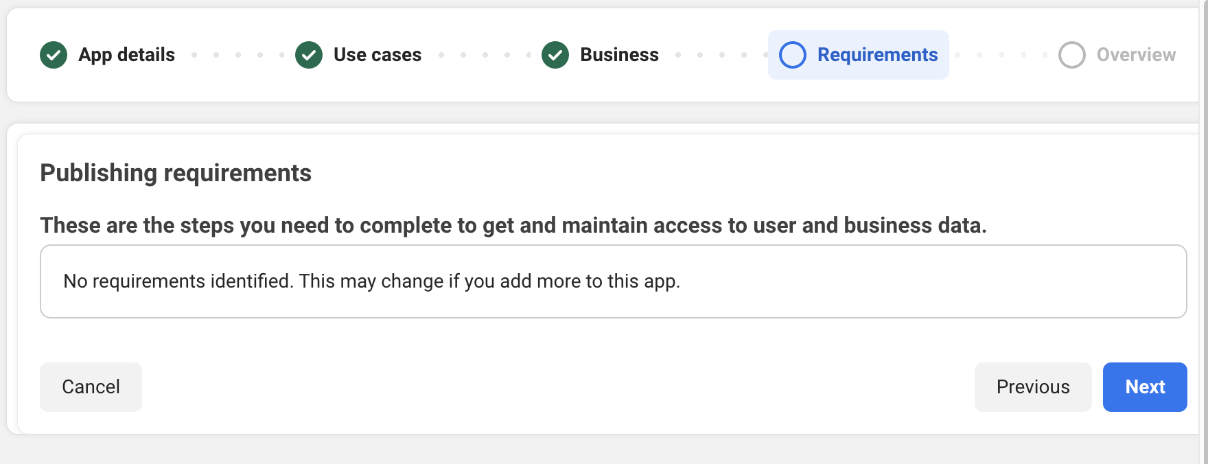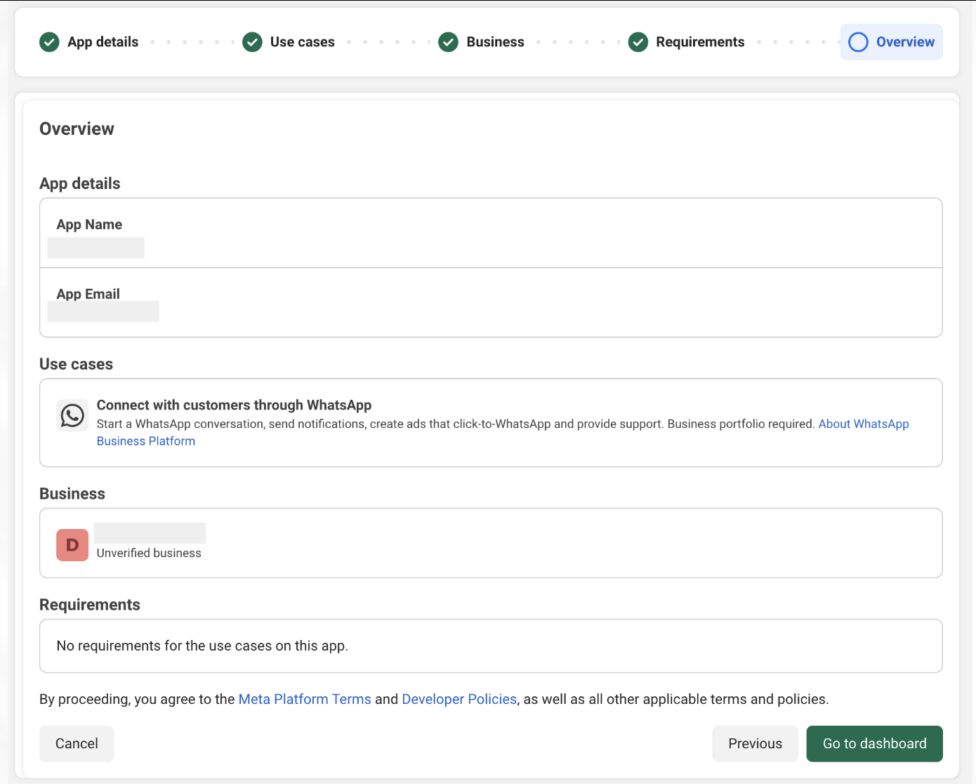 Once you have completed business verification, you can submit your app for App Review. You’ll need to complete the following tasks: